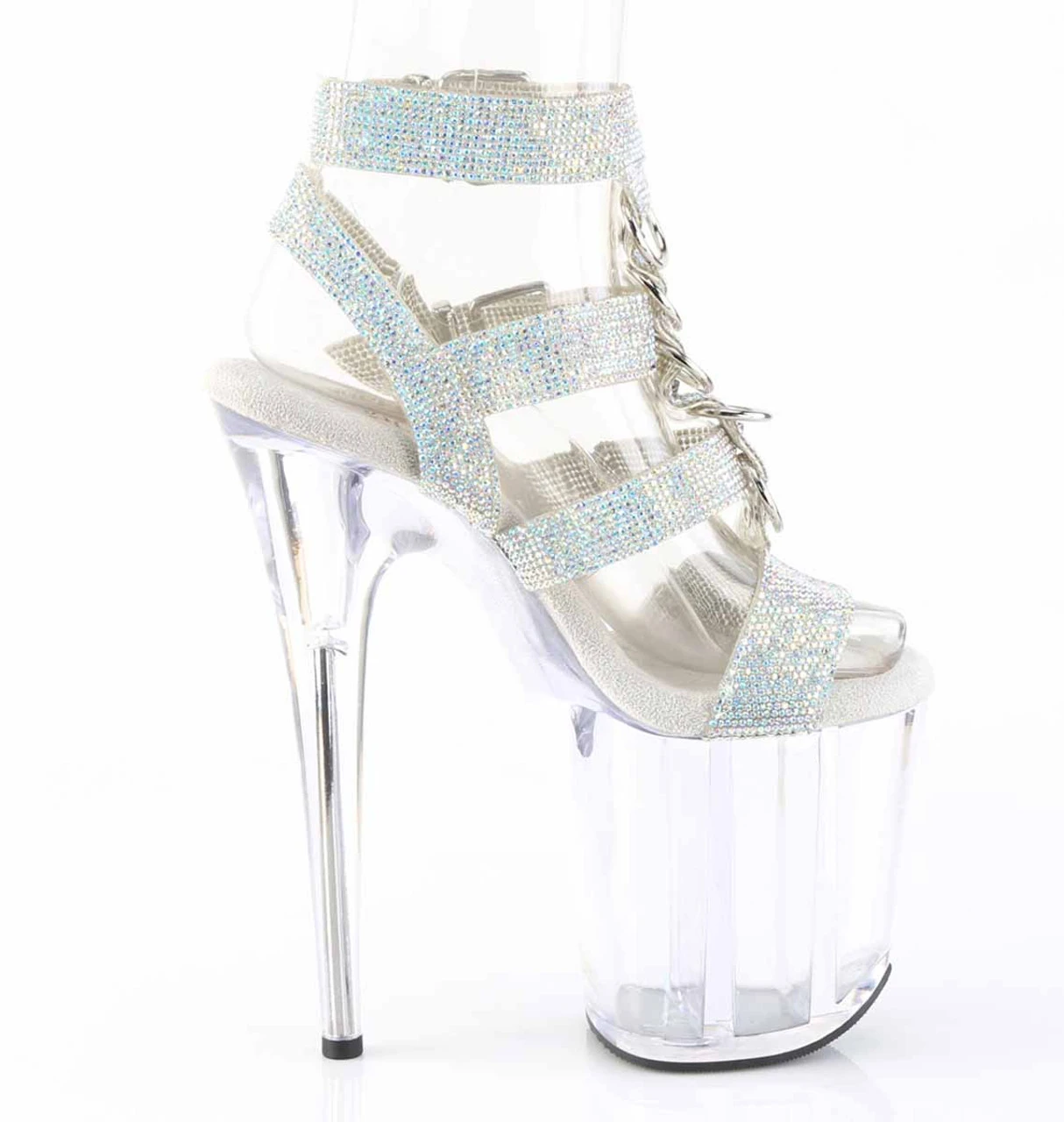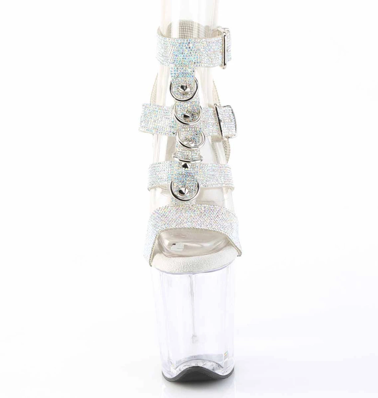 8″ (200mm) Heel, 4″ (100mm) Platform Rhinestone Embellished Strappy T-Strap Sandal Featuring Two Adjustable Buckle Straps, Cone Studs and Hardware Accents Going Up the Middle of the Shoe