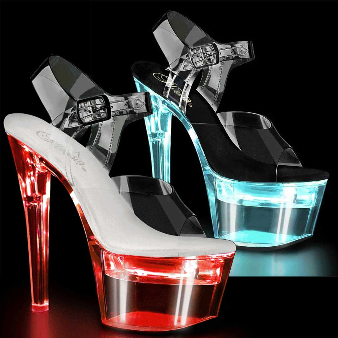 Pleaser Shoes Flashdance-708 Approximtately 7 Inch LED (17.8cm) Heel, 2 3/4 Inch (7cm) Platform USB chargeable, LED Illuminated Ankle Strap Sandal Featuring 7 Color Changes and 4 Lighting Patterns