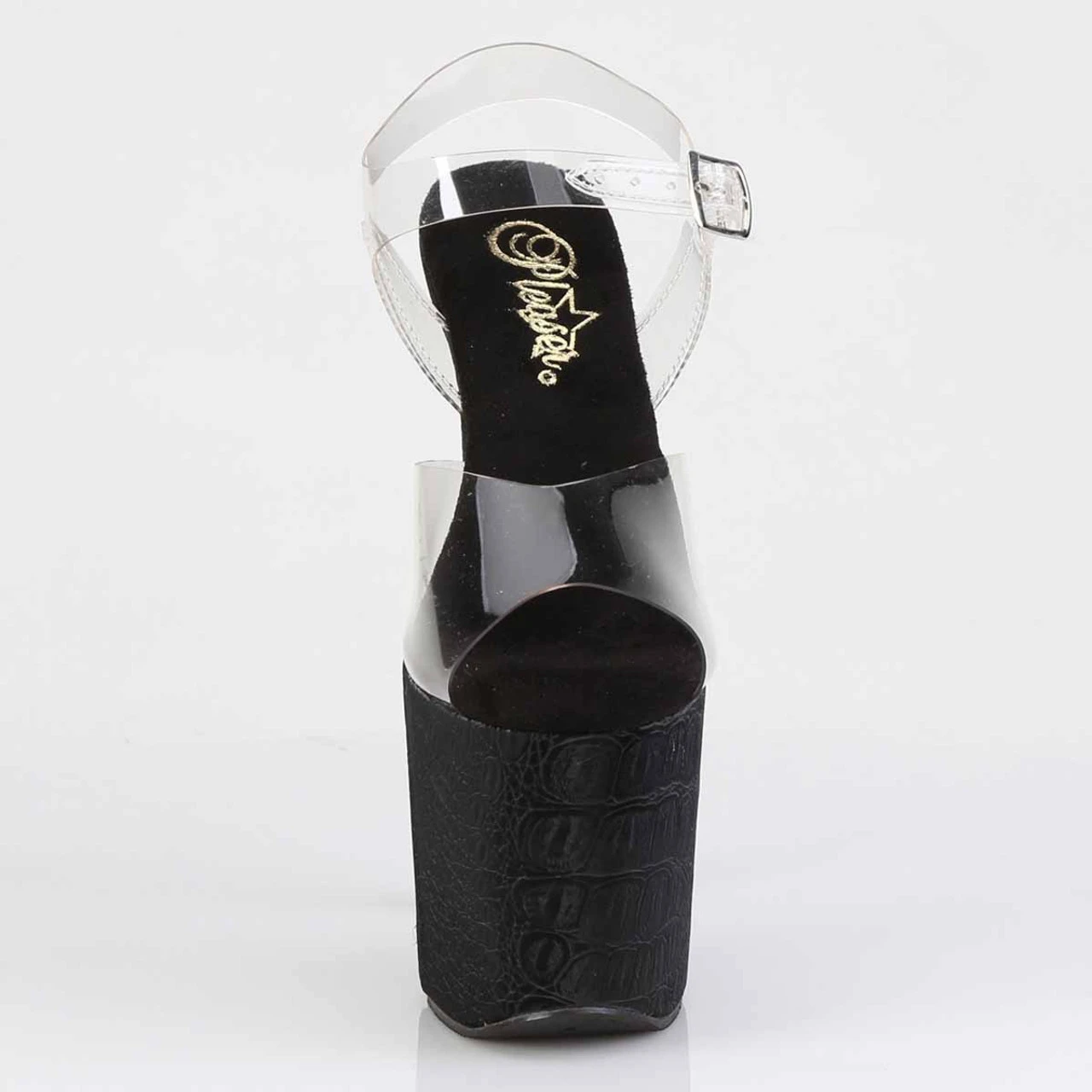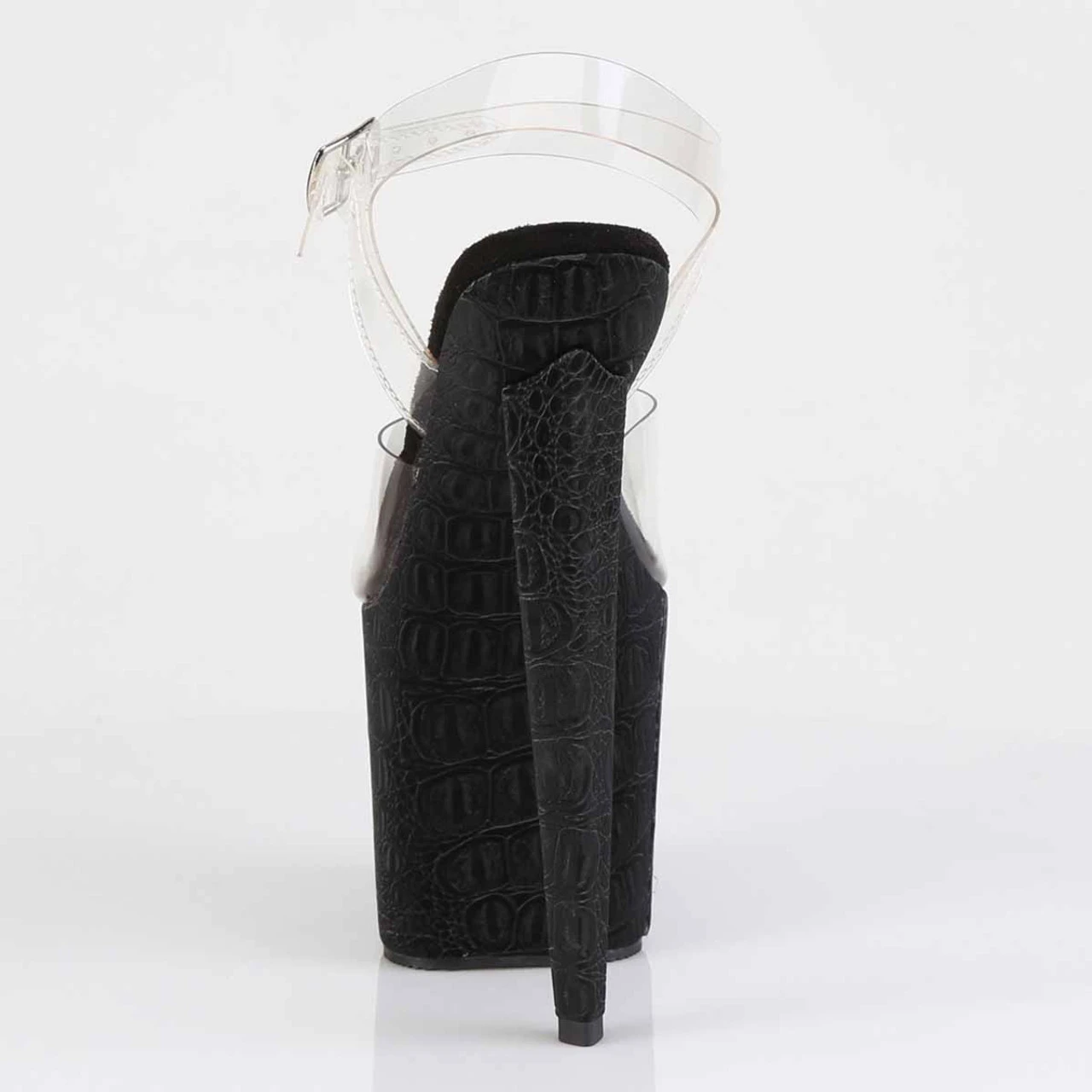 8″ (200mm) Diamond Shaped Heel, 3 1/2″ (90mm) Platform Ankle Strap Sandal Featuring Reptile Print Wrapped Platform Bottom