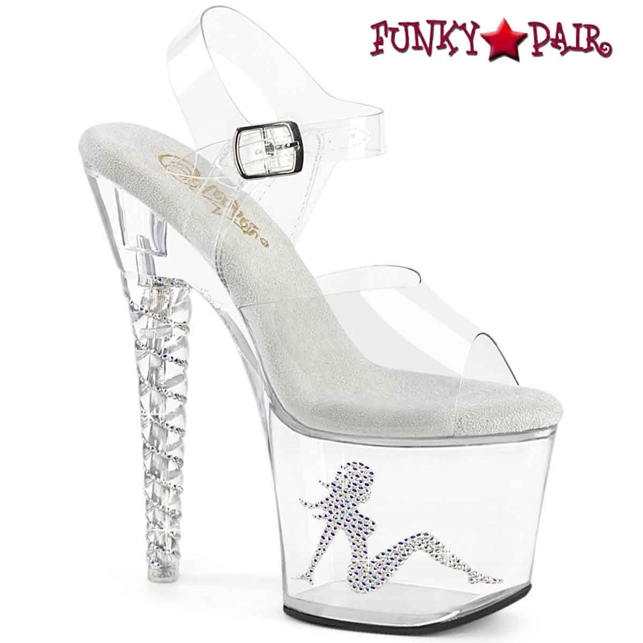 7″ (178mm) Unicorn Heel, 3 1/4″ (83mm) Platform Ankle Strap Sandal Featuring Spiral AB Rhinestone Embellished Heel and Trucker Girl Silhouette on the Outer Side of Platform Bottom