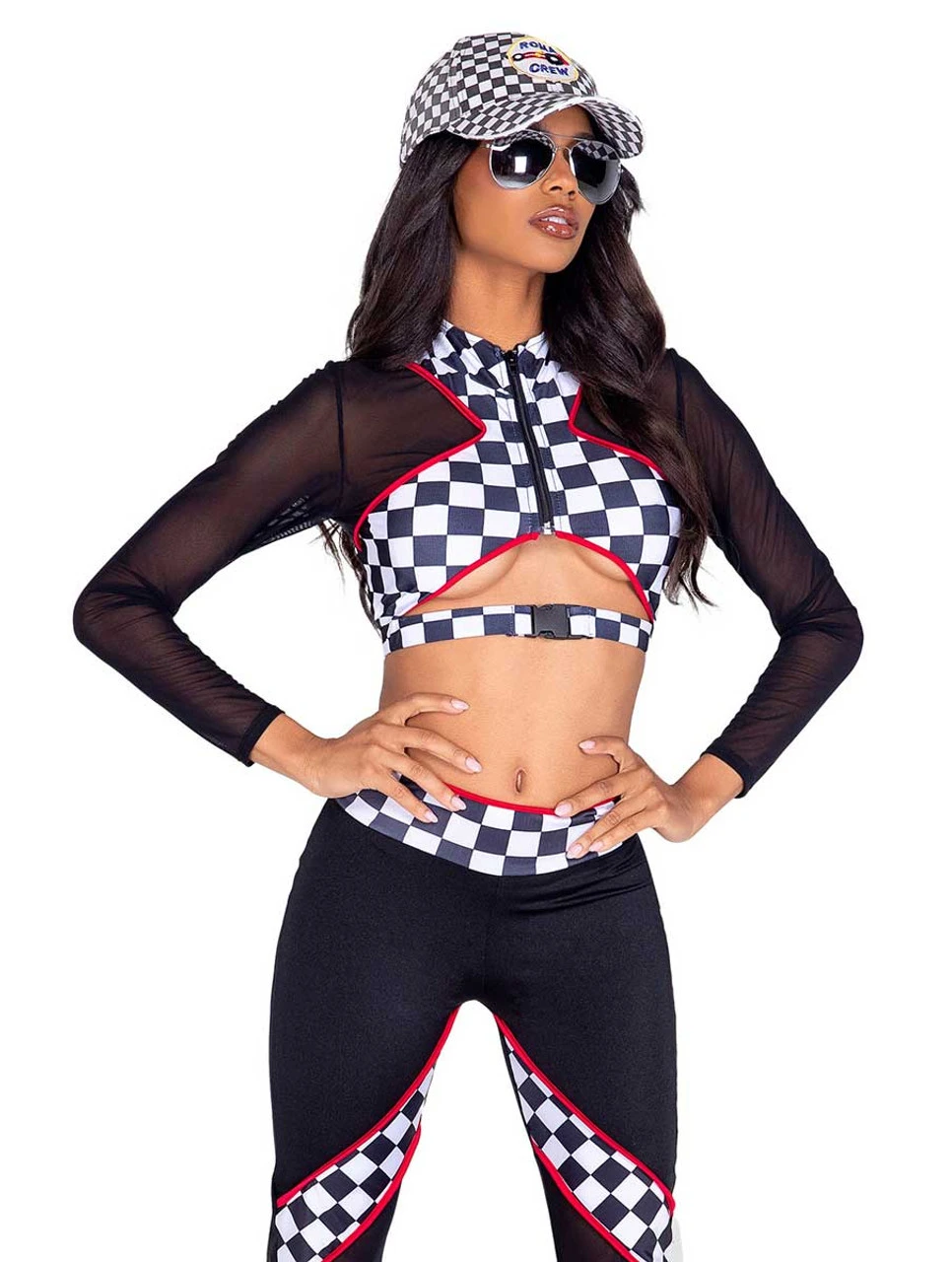 Racer Costume Includes Long Sleeved Cropped Top & Pants. Glasses and Hat Sold Separately