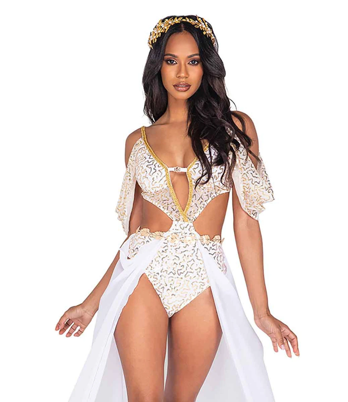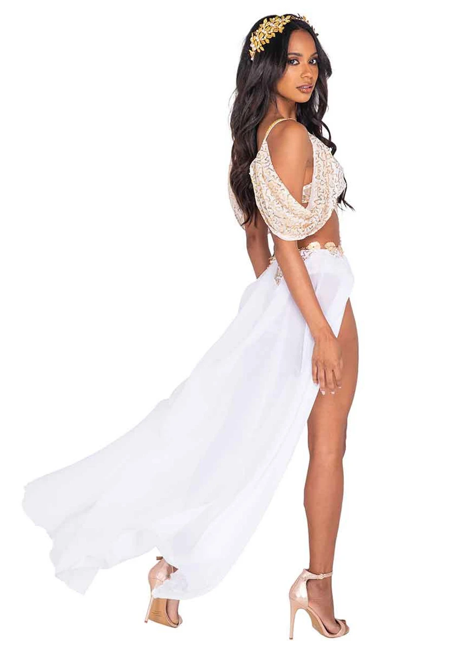 2 PC Goddess Glam includes: Bodysuit with Train and Detailed Trim, & Gold Leaf Belt. Headband not included