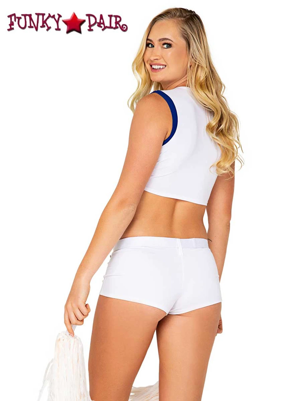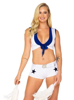 Cheerleader Costume includes: Tie-Top, Shorts, Belt, & Pair of Pom-Poms