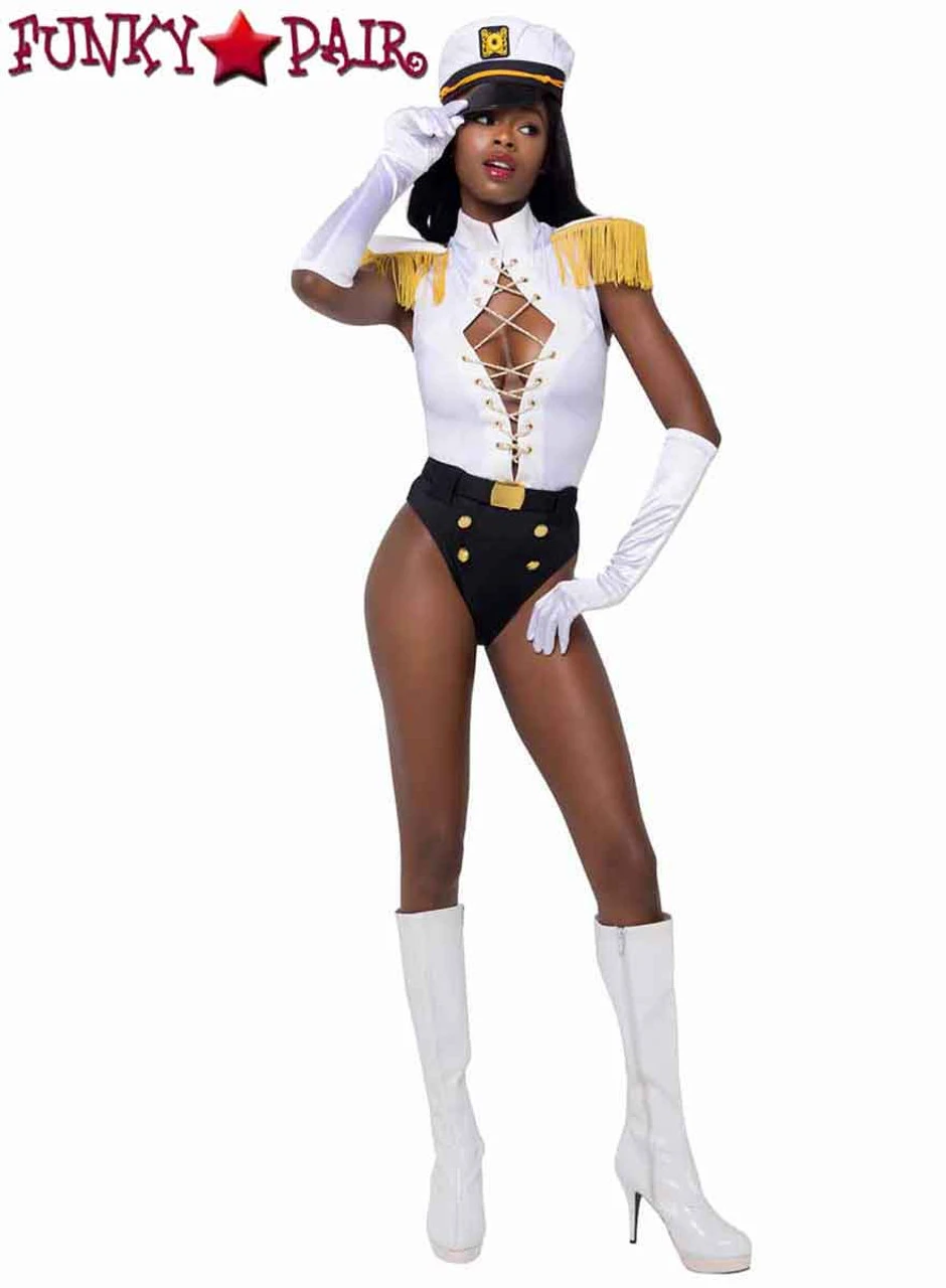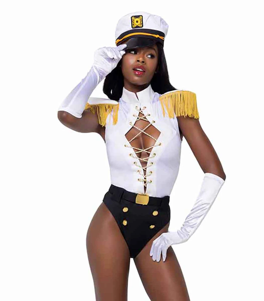 3 PC Nautical Sailor Captain includes: Lace-Up Bodysuit with Fringe Shoulder Pads, Hat, and Belt. Gloves Not Included.