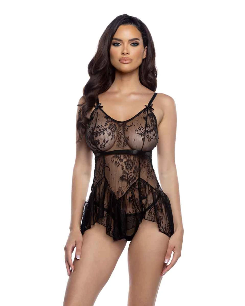 Floral stretch lace, Satin trim & ribbon bow detail, Gathered handkerchief skirt