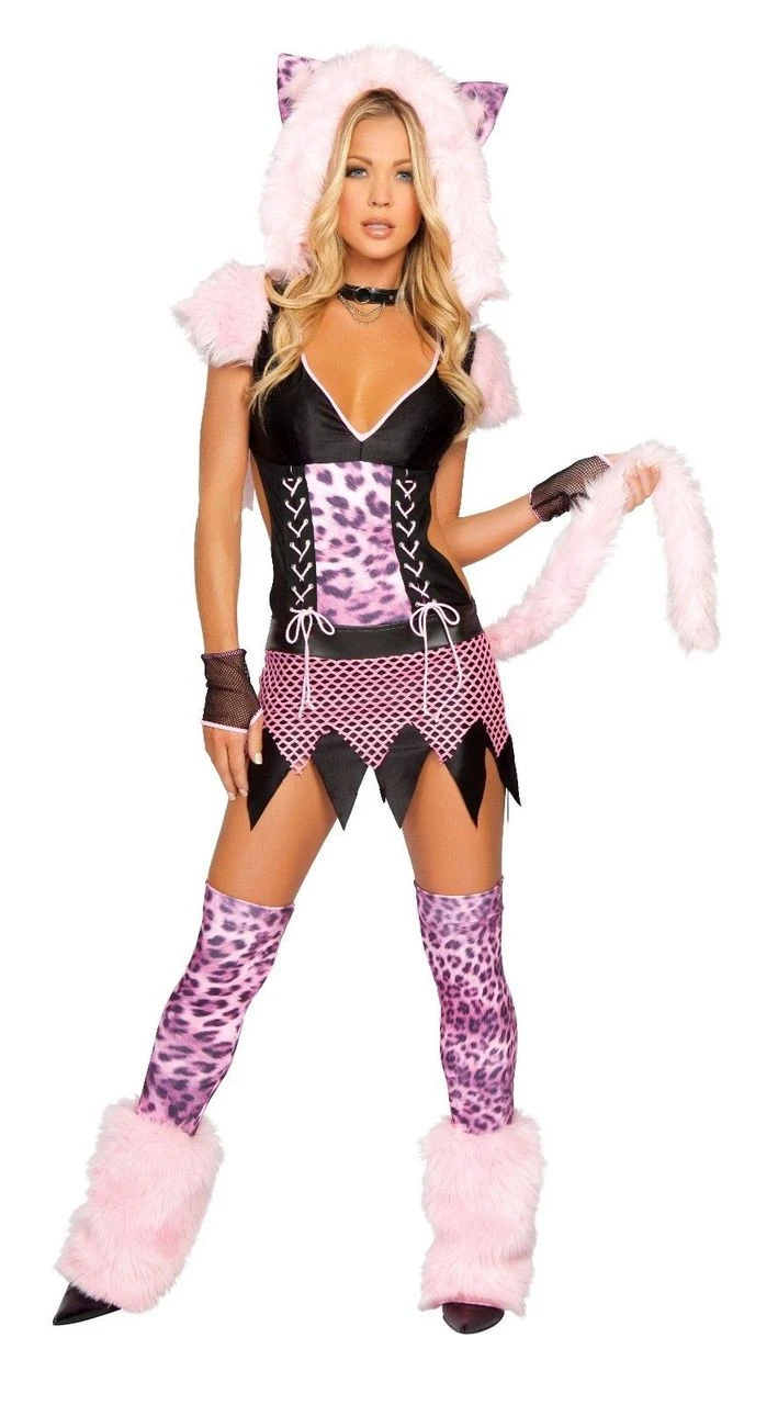 3pc Naughty Pussycat costume includes hood with connected ears, dress and tail (legwarmer not included)