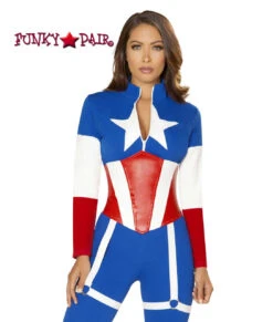 2 PC American Commander costume includes multi-tone catsuit with white star detail and zipper closure, and back lace-up waist cincher with attached white garter with silver O-ring.