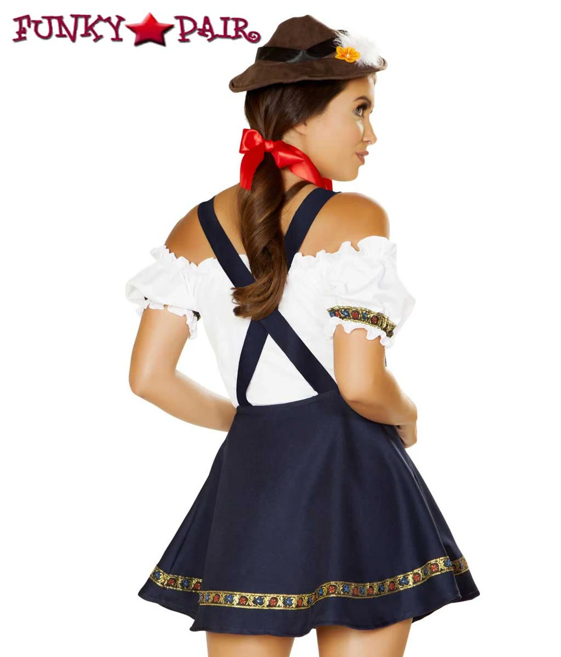 3PC Bavarian Beauty includes white top with off the shoulder sleeve with trim, suspender skirt with trim detail and hat.
