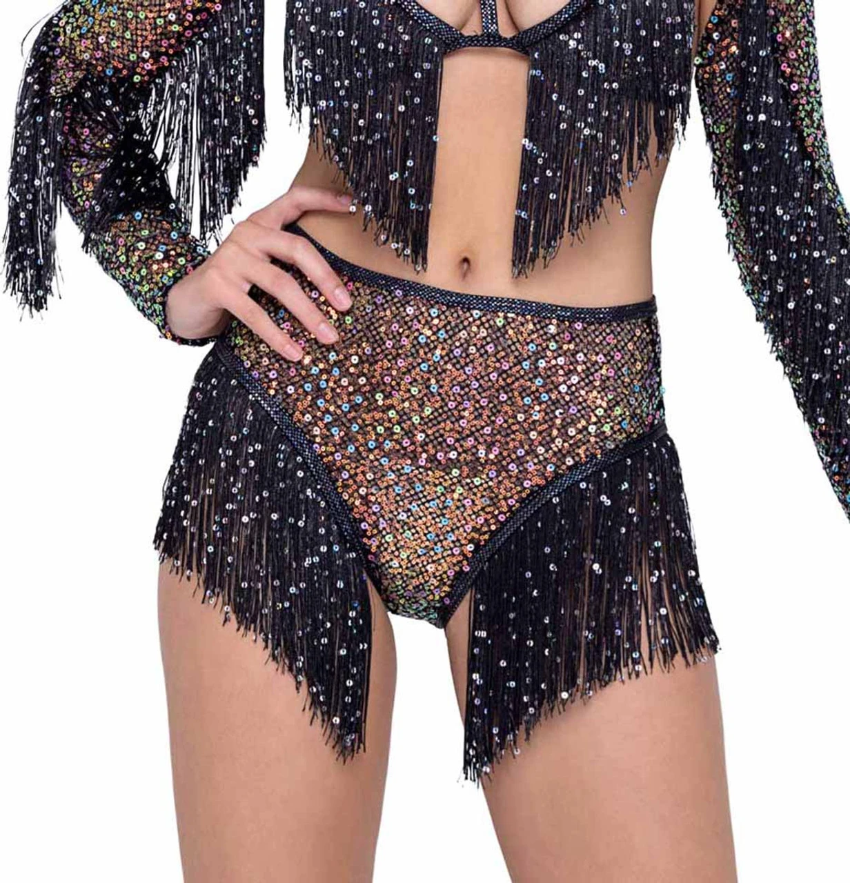 Sequin Fishnet High Waisted Shorts with Sequin Fringe Detail