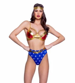 4pc Woman Power Costume Includes: Two-Tone Bra, High-Waisted Star Print Shorts, Belt, and Headband