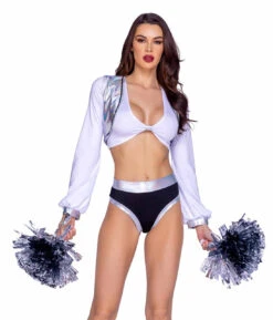 4pc Las Vegas Cheerleader Costume Includes: Long Sleeved Blouse, Vest with Sequin Trim, Shorts, and Pom Poms.