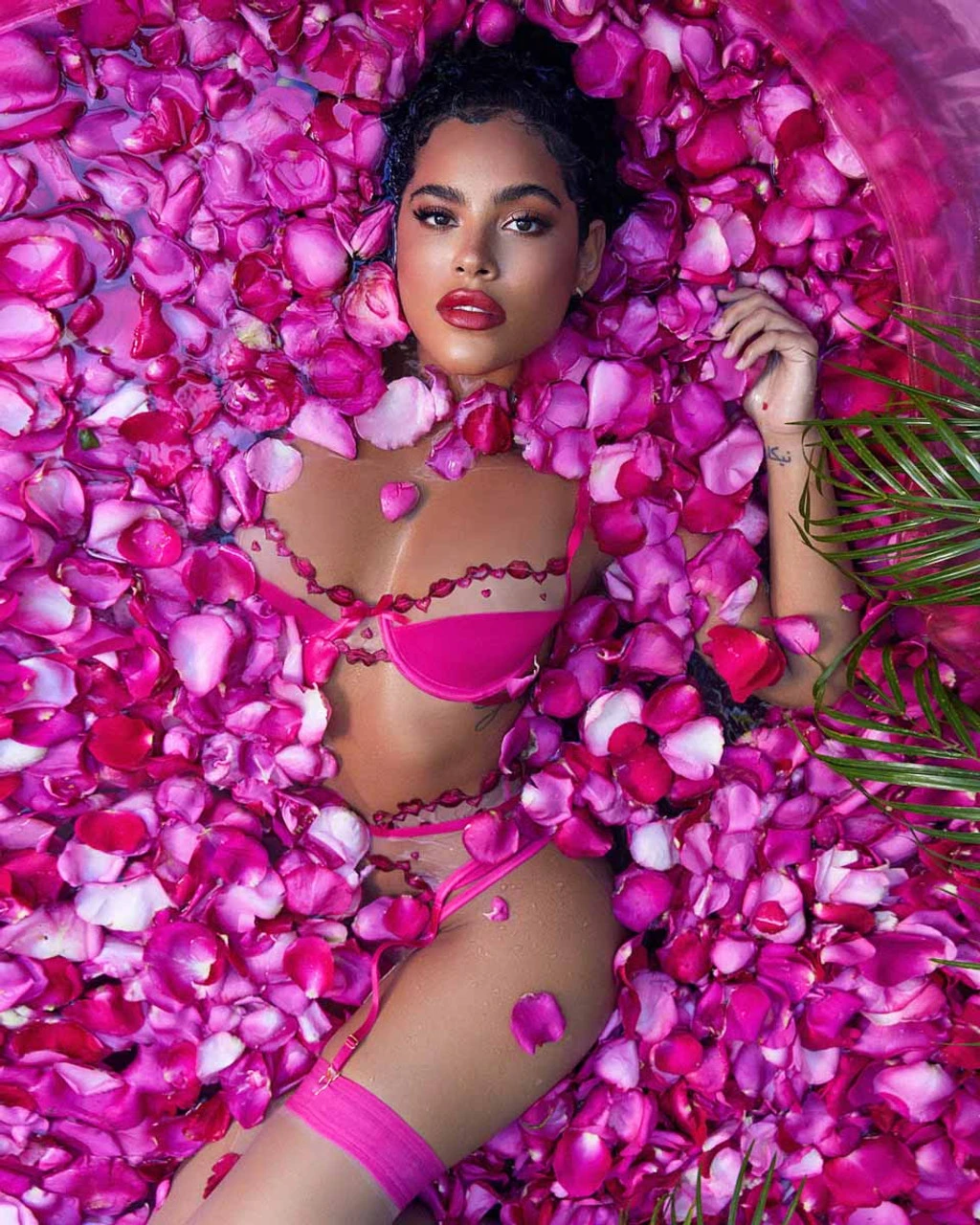 Lips & hearts embroidered balconette cup bra with underwire, embroidered garter belt with adjustable straps, and single back string thong. Stockings sold separately.