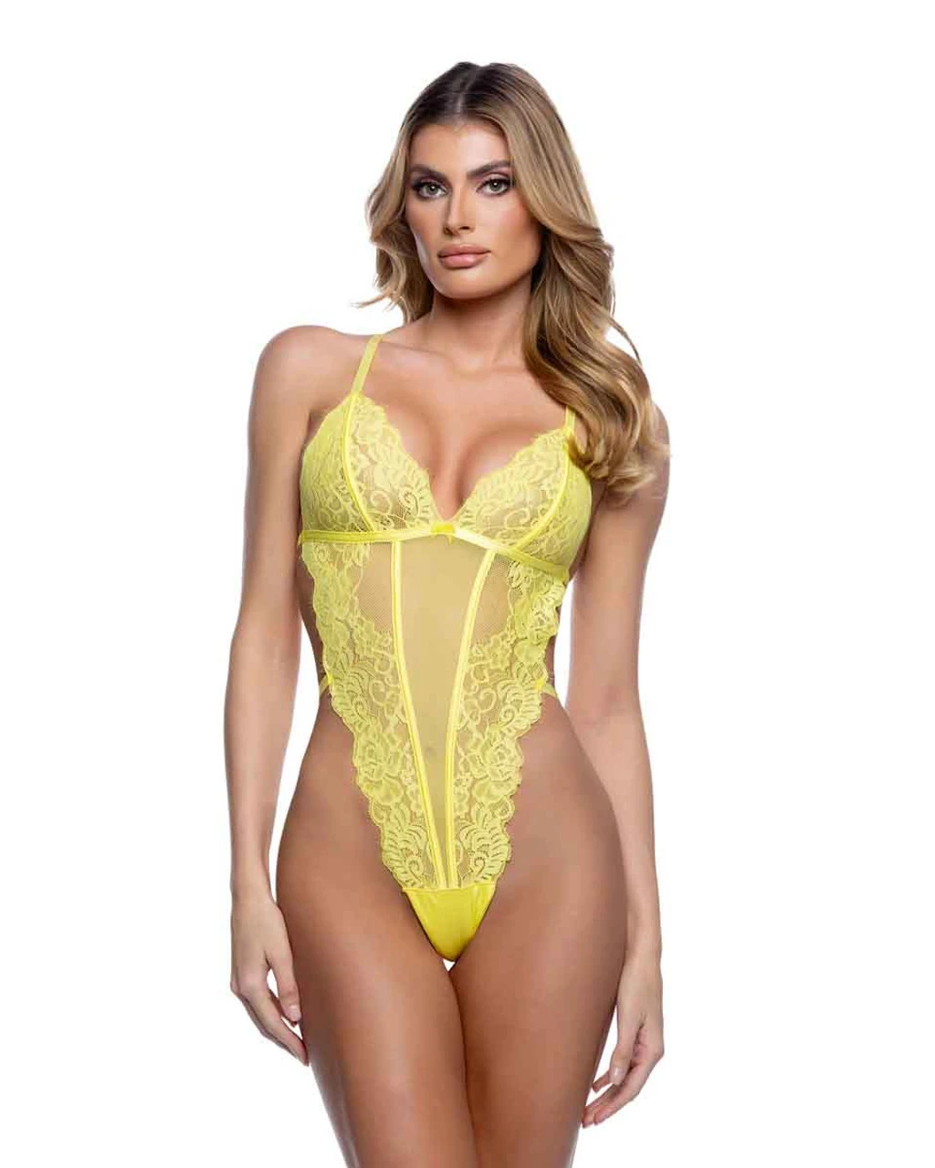 Floral stretch eyelash lace and mesh, Plunge bralette cup, Satin trim & ribbon bow detail, Cotton gusset, Single string thong back
