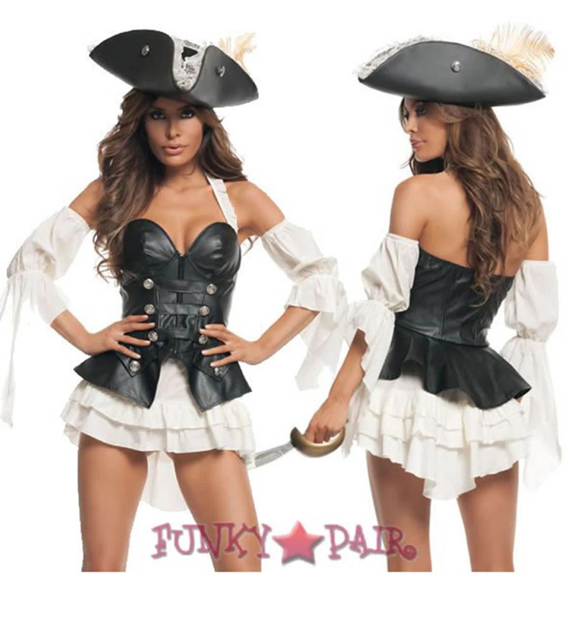 Pirate Costume includes black top with button details in the front, white skirt with ruffles trim, and matching white sleeves. Hat sold separately.