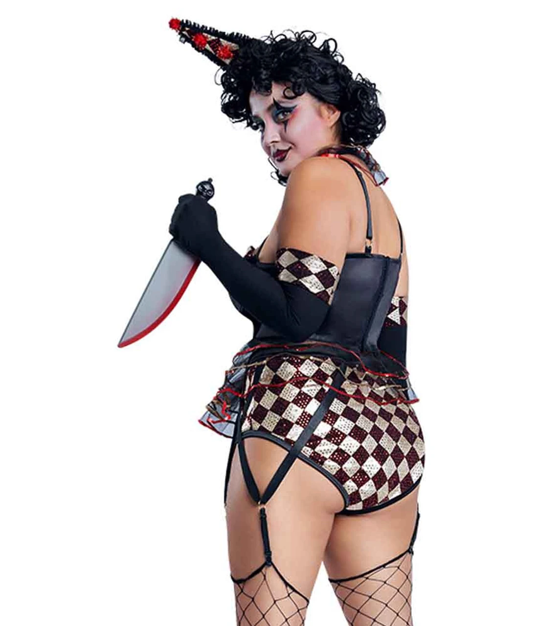 Plus Size Killer Clown Black Costume Includes: gold and red diamond print with black wet look spandex, tulle ruffle collar and waist with sequin trim. Hat, knife, and gloves included. Thigh highs and wig not included.