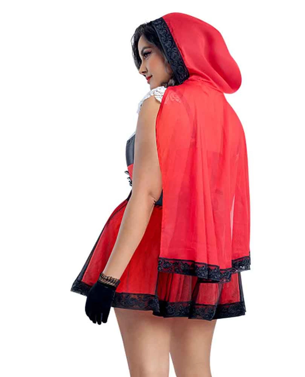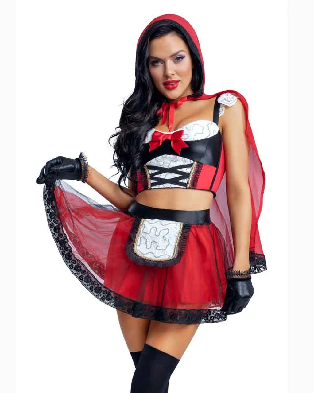Little Red Costume Includes: lace and gold sequin detail padded cup long line top with black mesh over red tulle skirt, with attached apron. Sheer hooded cape, and gloves included.