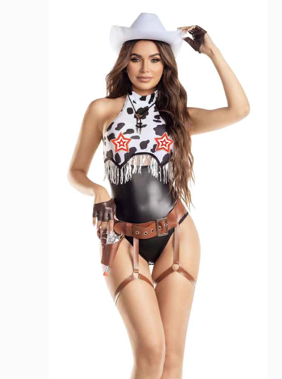 Bullseye Cowgirl Costume black stretch faux leather and cow print spandex teddy with sequin bullseye star patches, and sequin fringe details at bust. Comes with brown belt with garters, bandana, and bolo tie.