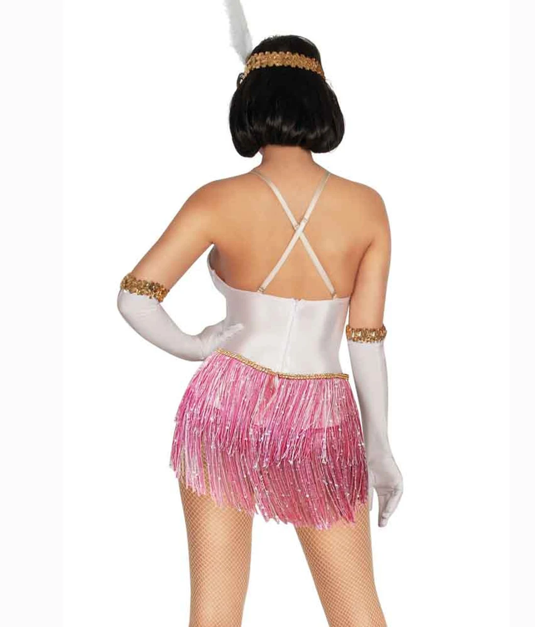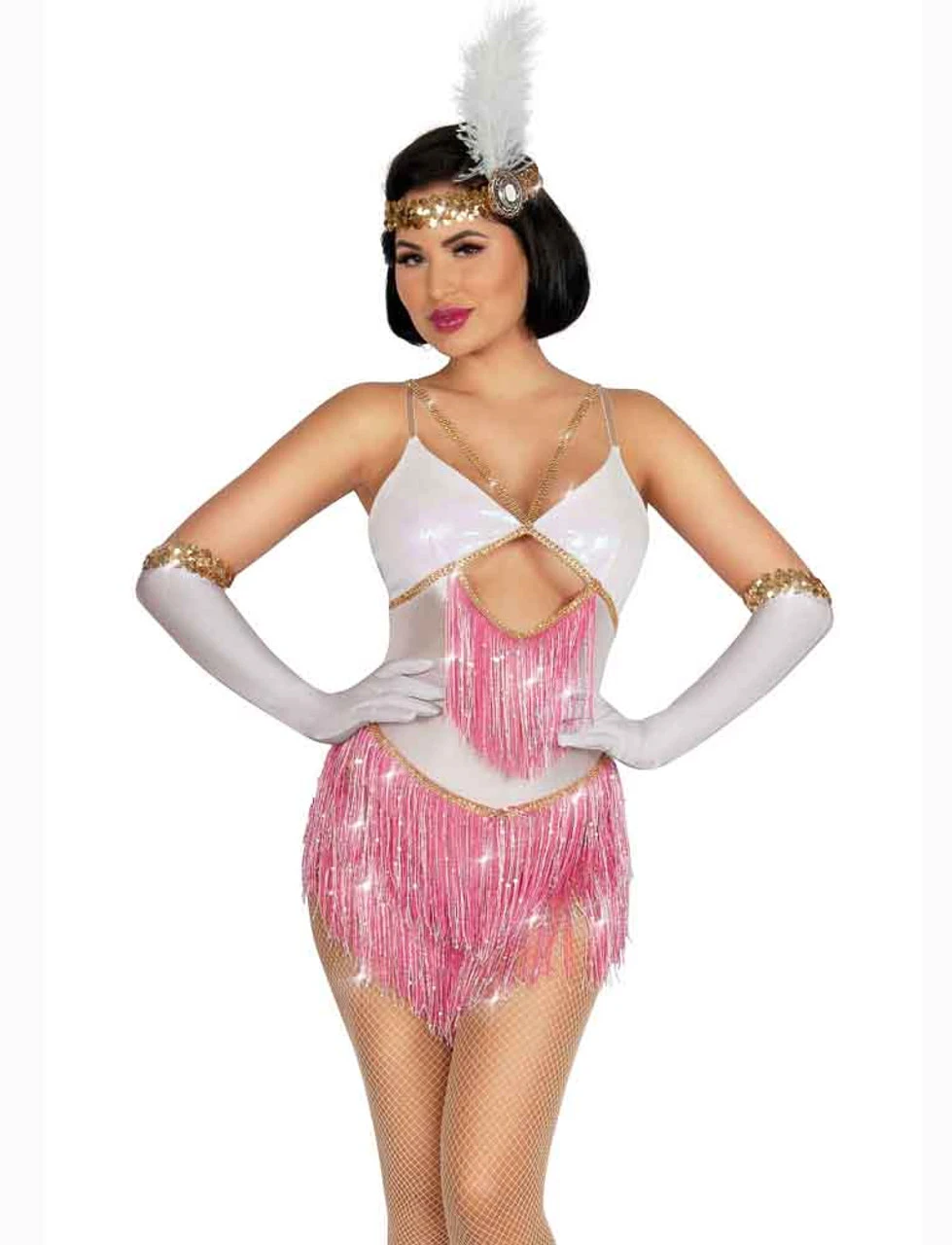 Rosé Flapper Costume satin finish baby pink spandex with iridescent sequin at bust, sequin fringe trim and gold faux rhinestone accents. Includes satin gloves and gold sequin feathered headpiece.