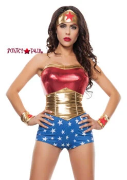 Sexy Super Hero Girl Costume includes one piece romper with star shorts, matching gold waist cincher, head piece and arm cuffs