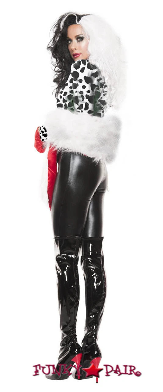 Cruele Costume includes wet look jumpsuit with spots detail, Neck piece and shawl. Wig, gloves and cigarette holder not included