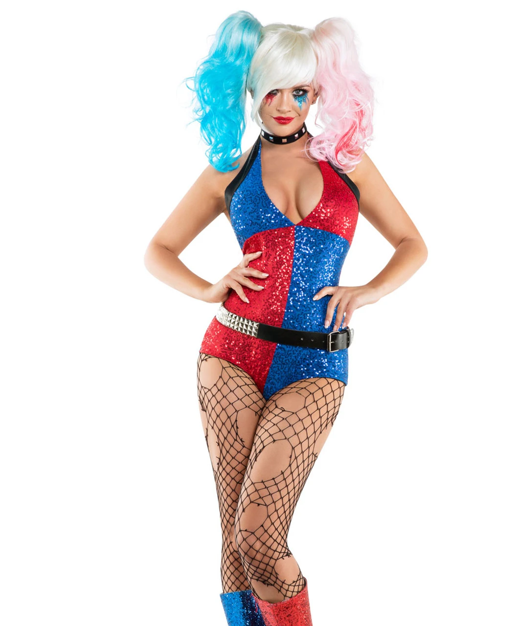 Sexy Suicide Gal Costume includes two-tone sequin spandex romper with wet look accents, black studded belt and choker. ( wig and hosiery sold separately )