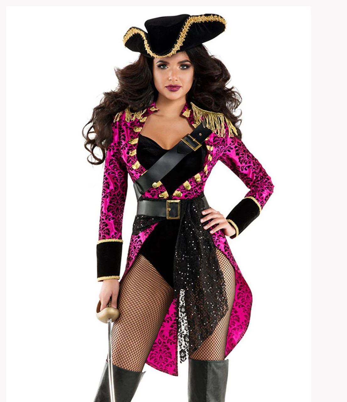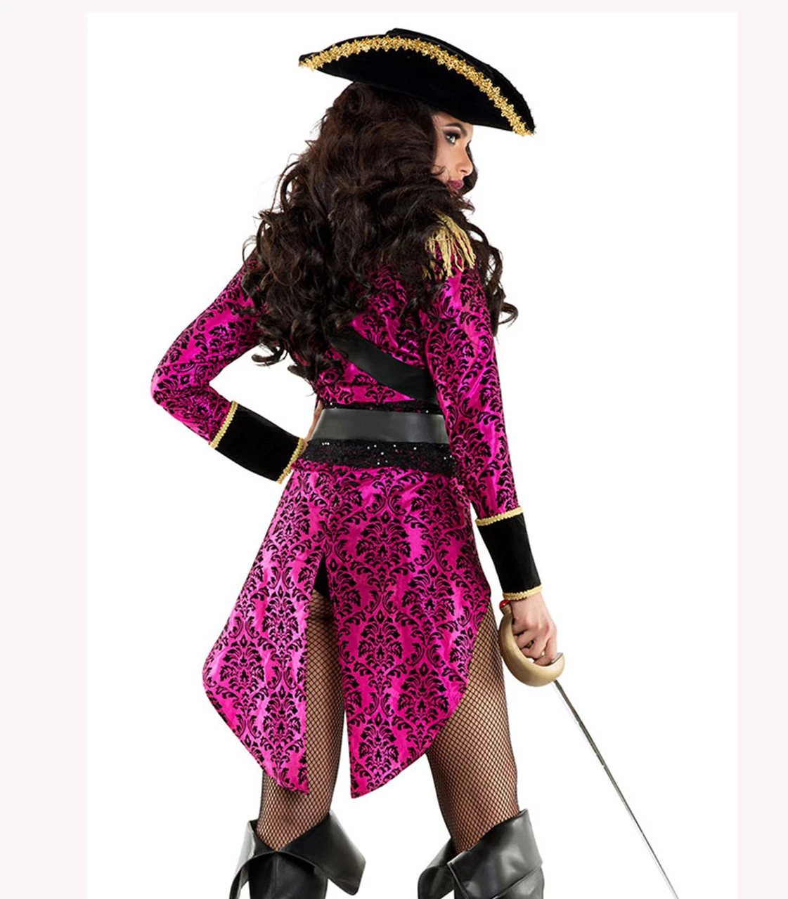 Sexy Pirate Costume includes black velvet romper. Flocked taffeta jacket with gold front buttons and velvet and fringe epaulets. Black sequin lace sash and faux leather belt, and hat. Sword and hosiery not included.