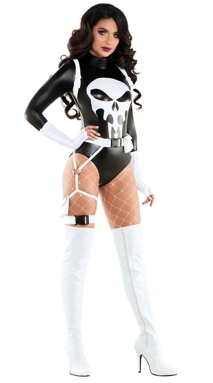 Punishing One Costume includes black wet look romper with screen printed artwork and white zipper accents. Comes with matching belt and gloves. Hosiery sold separately