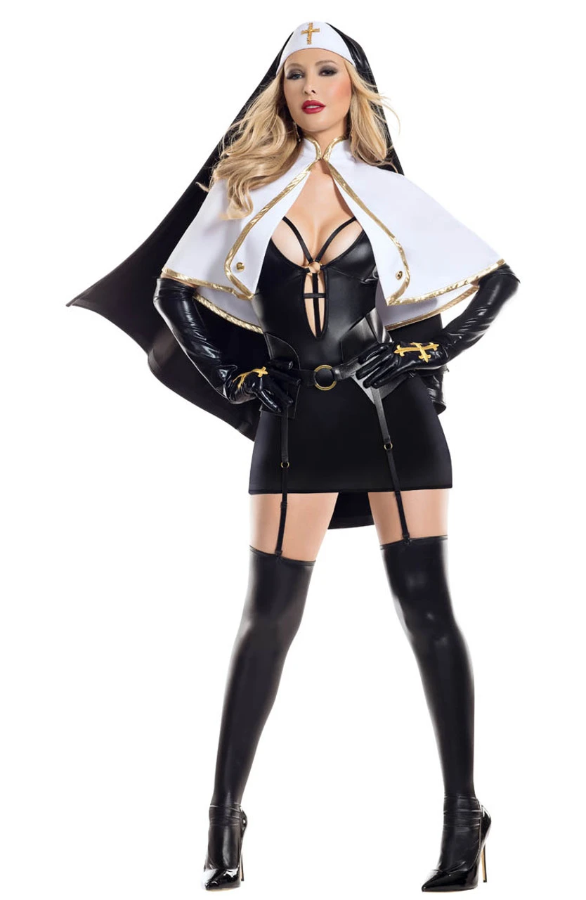 Blasphemous Babe Costume includes black wet look skirt with straps paired with corset with gold hardware and garters, leg pieces, cross embellished gloves, cape with gold binding, and dramatic veil.