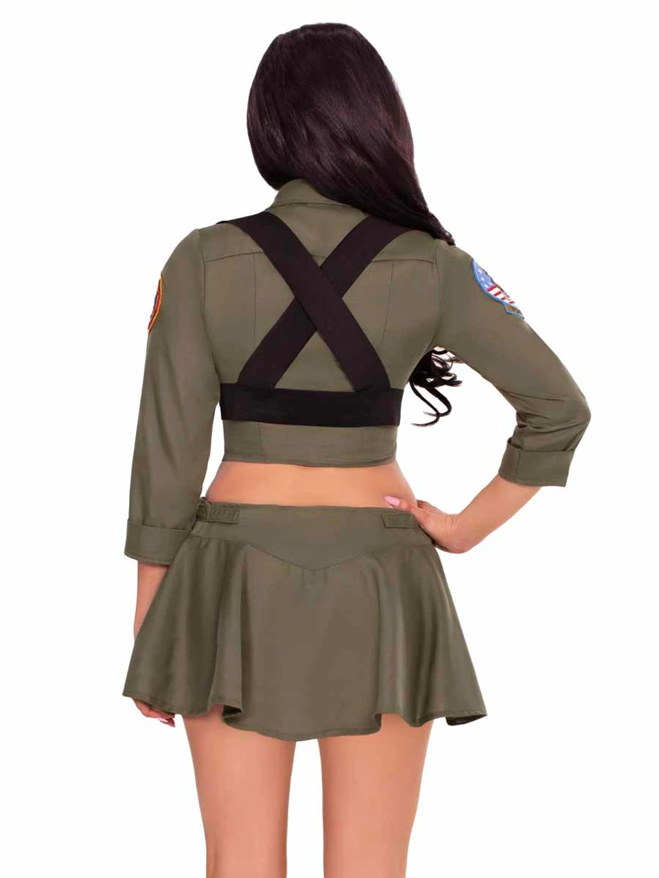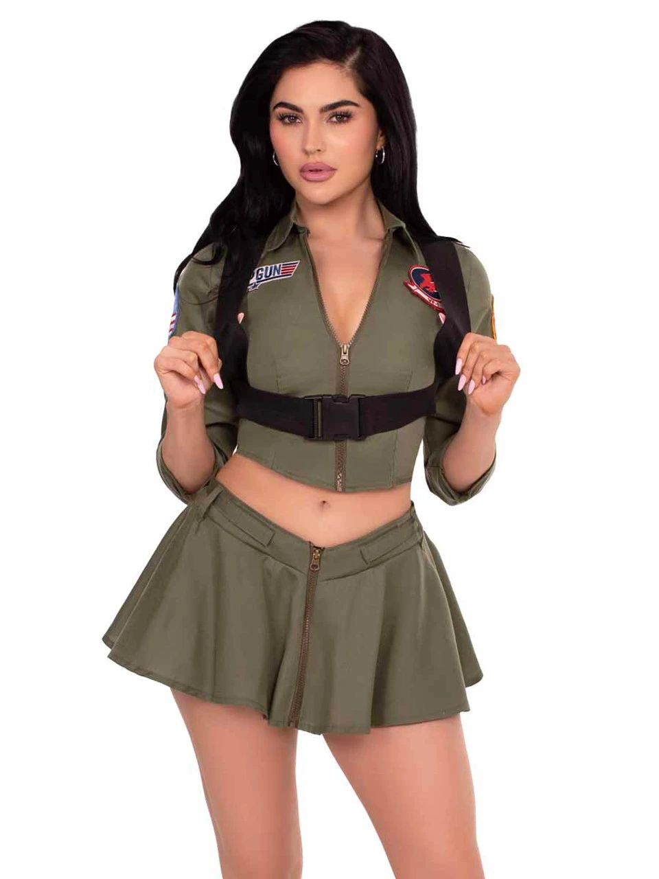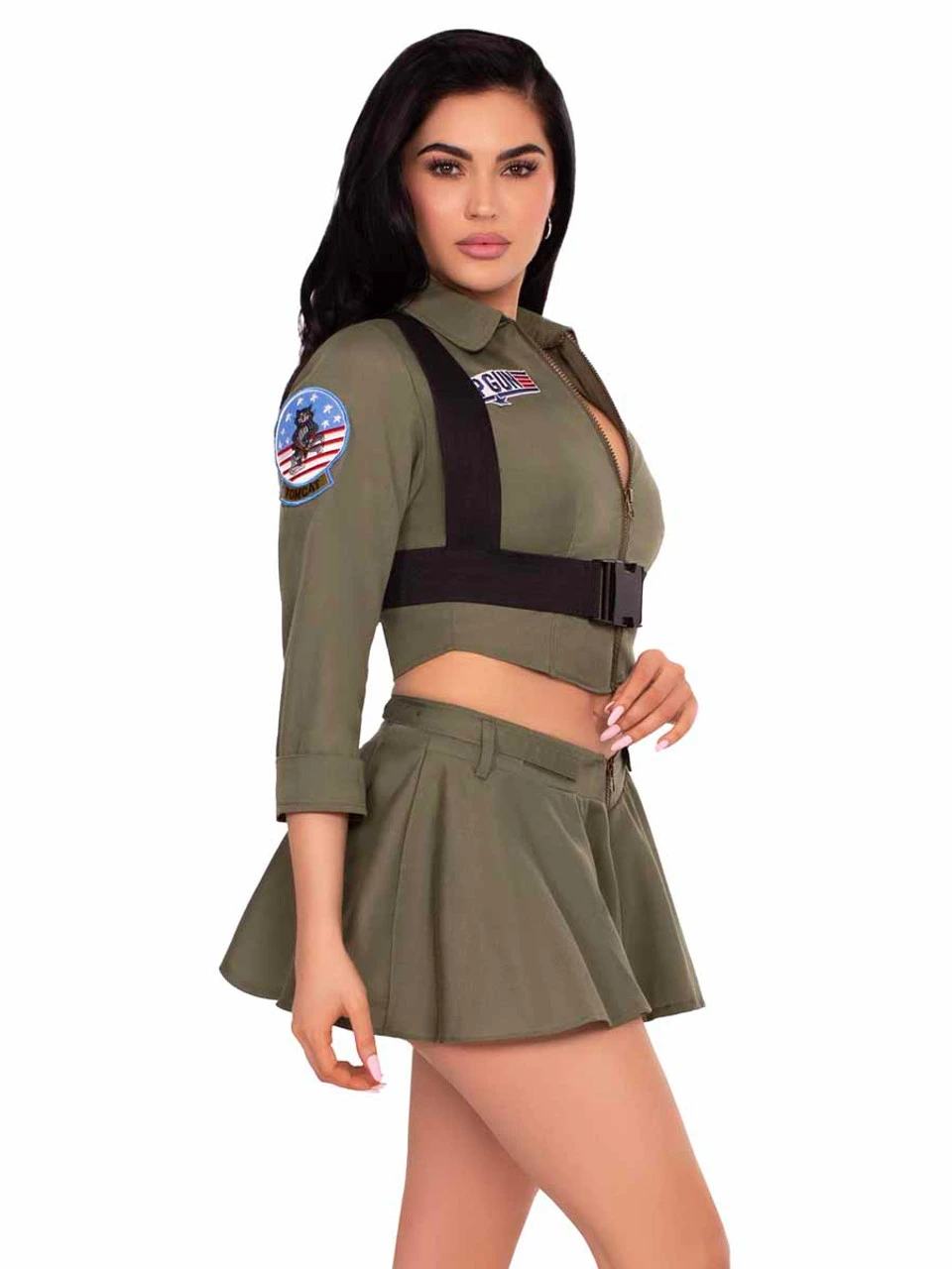 Includes Zip-Up Crop Top with Badge Accents, Body Harness, and Zipper Front Skirt. Sun Glass sold separately.